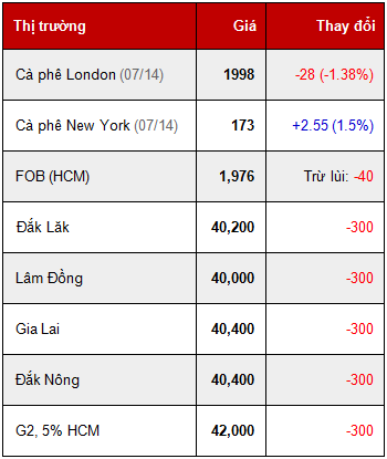 Hôm nay (01/07), giá cà phê tại thị trường Việt Nam giảm trở lại, trong khi đó giá cà phê thế giới trên hai sàn ICE và Liffe tiếp tục diễn biến trái chiều nhau. Trong phiên giao dịch đêm hôm qua, giá cà phê Robusta trên sàn Liffe kỳ hạn 07/14 giảm 28 USD/ tấn hay -1,38% xuống còn 1998 USD/ tấn, các kỳ hạn khác cũng giảm 16 - 18 USD/ tấn. Giá cà phê arabica trên sàn ICE kỳ hạn 07/14 tăng 2,55 cent/lb hay +1,5% lên mức 173 cent/lb, các kỳ hạn khác cũng tăng 2,55 - 2,65 cent/lb. Sáng nay, giá cà phê nhân xô tại Tây Nguyên quay đầu giảm trở lại 300 ngàn đồng/ tấn xuống còn 40 - 40,4 triệu đồng/ tấn.